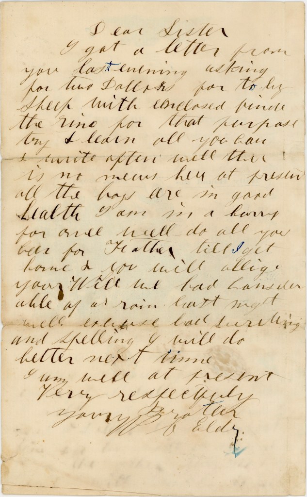 I got a letter from you last evening asking for two dollars for to buy sheep with. Enclosed find the [ ] for that purpose. Try and learn all you can and write often. Well, there is no news here at preset. All the boys are in good health. I am in a hurry for once.