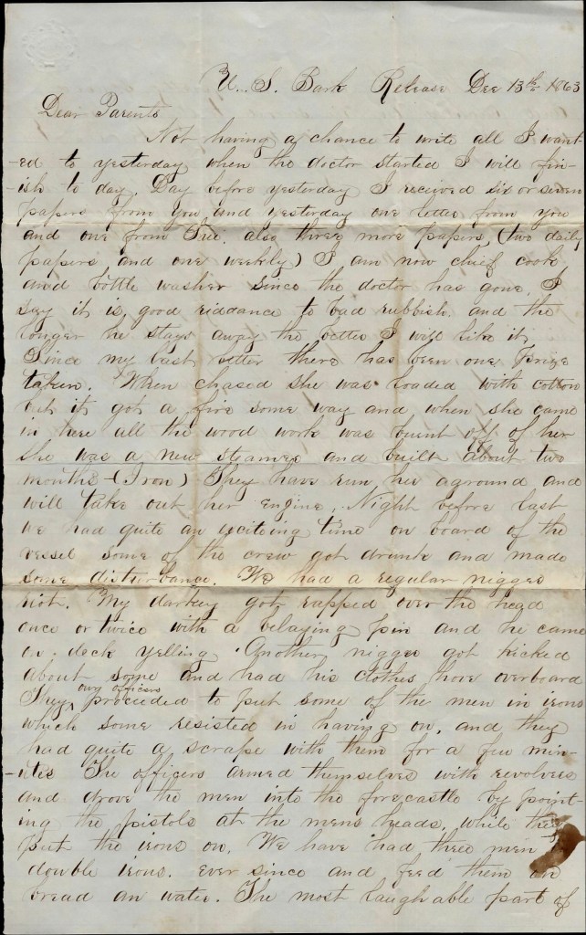 Since my last letter there has been one prize taken. When chased she was loaded with cotton but it got a fire some way and when she came in here, all the wood work was burnt off of her. She was a new steamer and built about two months (Iron). They have run her aground and will take out her engine.
