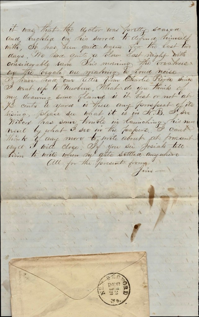 I have had one letter from Charlie Price since I went up to Newbern. What do you think of my drawing some flannel. It is best or not at 72 cents a yard? Is there any prospect of its rising? Please see what it is in New Bedford.