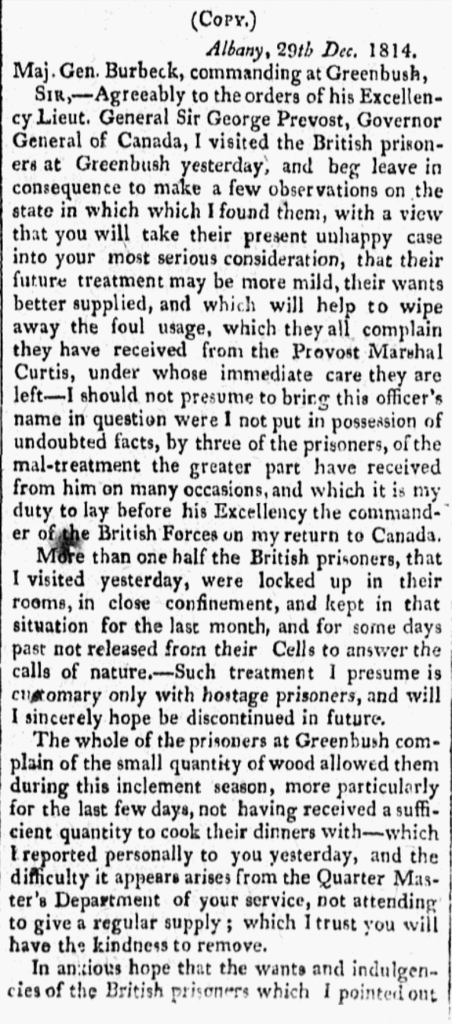 The British Prisoners of War here now in this depot have expressed to me the many obligations they all feel under for the humane and kind treatment they have received since they were placed under your charge and beg to assure you, I shall not fail to make it known on my return to Canada to his Excellency, Lt. General Sir George Prevost.