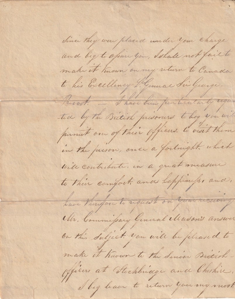 I have been particularly requested by the British prisoners to beg you will permit one of their officers to visit them in the prison once a fortnight, which will contribute in a great measure to their comfort and happiness, and , have therefore to request on your receiving Mr. Commissary General Mason’s answer on this subject. You will be pleased to make it known to the Senior British Officers at Stockbridge and Cheshire.
