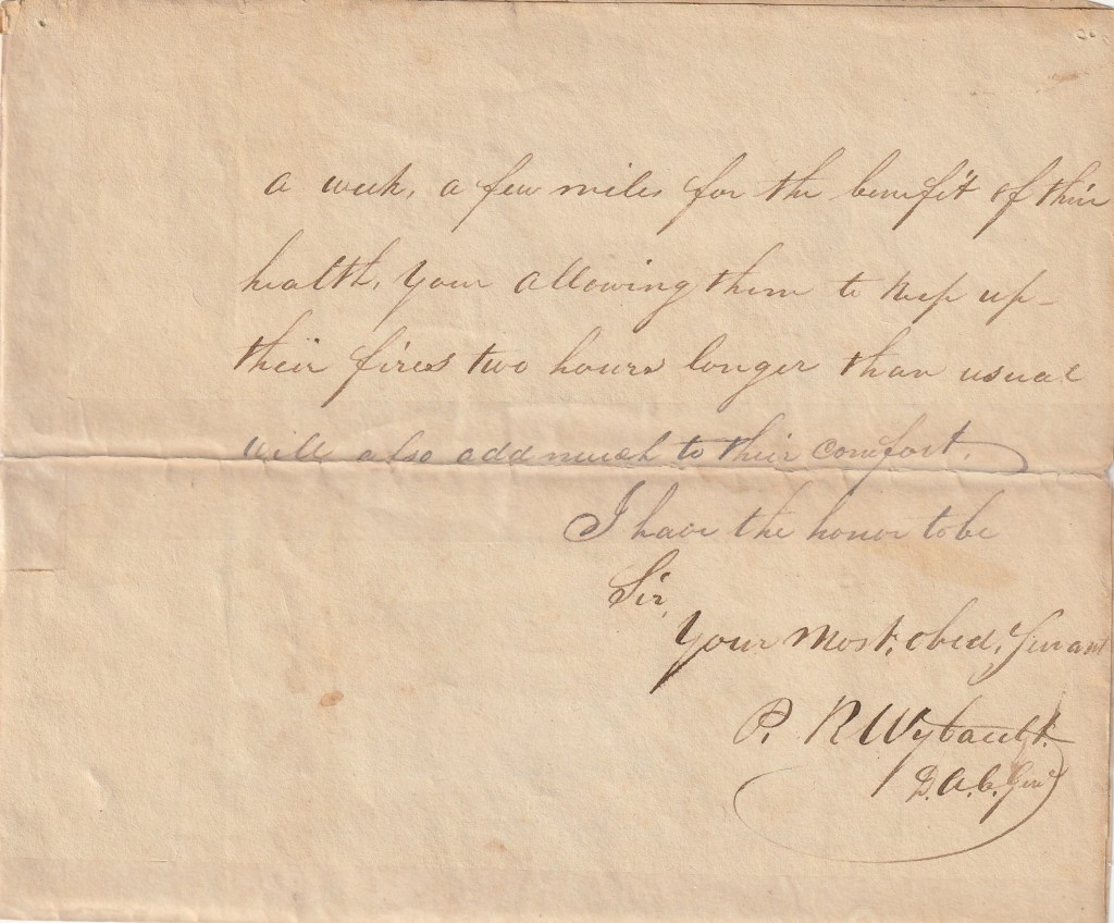 I beg leave to return you my most sincere thanks, as also to Col. [Simon] Larned for the permission you have granted to British Prisoners in allowing them to march into the country once a week a few miles for the benefit of their health. Your allowing them to keep their fires two hours longer than usual will also add much to their comfort. I have the honor to be, sir, your most obedient servant, — P. R. Wybault, D. A. C. Gen’l