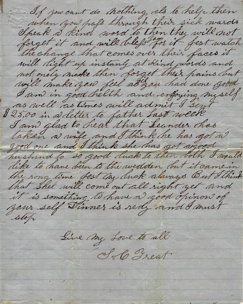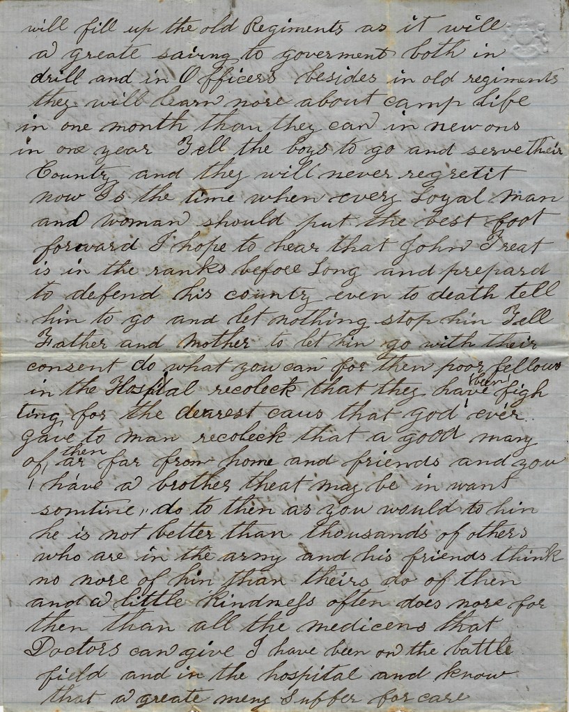 Drafting is a good thing and I was glad our government has adopted that system. Had they gone at that one year ago, the war would have been at end now and that system brings all on the level as it has no respect for a man’s ricjes. I hope they will fill up the old regiments as it will be a great saving to government both in drill and in officers. Besides, in old regiments they will learn more about camp life in one month than they can in a new one in one year. Tell the boys to go and serve their country and they will never regret it. Now is the time when every loyal man and woman should put the best foot forward. I hope to hear that John Treat is in th ranks before long and prepared to defend his country even to death. Tell him to go and let nothing stop him. Tell Father and Mother to let him go with their consent. Do what you can for them poor fellows in the hospital. Recollect that they have been fighting for the dearest cause that God ever gave to man, recollect that a good many of them are far from home and friends and you have a little brother that may be in want sometime. Do to them as you would to him. He is not better than thousands of others who are in the army and his friends think no more of him than their do of them. And a little kindness often does more for them than all the medicines that doctors can give. I have been on the battlefield and in the hospital and know that a great many suffer for care. If you can’t do nothing else to help them when you pass through their sick wards, speak a kind word to them. They will not forget it and will bless you for it. Just watch the change that comes over their faces. It will light up instantly at kind words and not only make them forget their pains, but will make you feel as if you had done good.