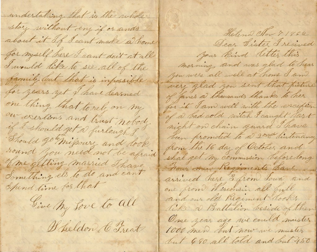 I have been promoted to a Second Lieutenancy from the 16th day of October and shall get my commission before long. Four new regiments have arrived here—3 from Iowa and one from Wisconsin—all full, and our old regiment looks like a Battalion beside of them. One year ago we could muster 1000 men but now we muster but 690 all told and but 450 able to take the field. Our Lieut.-Colonel has gone to Iowa to get 300 recruits and will be back before long.
