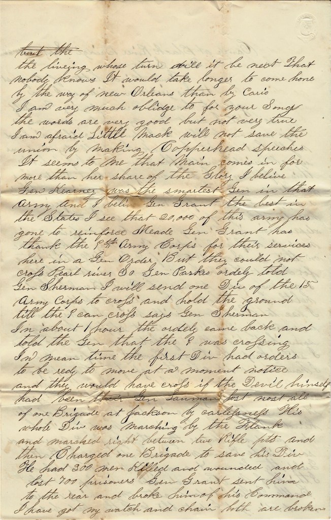 Gen. Grant has thanked the 9th Army Corps for their services here in a General Order but they could not cross Pearl river so Gen. Parkes’ orderly told Gen. Sherman I will send one Division of the 15th Army Corps to cross and hold the ground till the 9th can cross, says Gen. Sherman. In about one hour the orderly came back and told the Gen. that the 9th was crossing. In meantime, the First Division had orders to be ready to move at a moment’s notice and they would have cross if the Devil himself had been there. Gen. Lauman lost most all of one Brigade at Jackson by carelessness. His whole Division was marching by the flank and ,arched right between two rifle pits and then charged one Brigade to save his Division. He had 300 men killed and wounded and lost 700 prisoners. Gen. Grant sent him to the rear and broke him of his command.