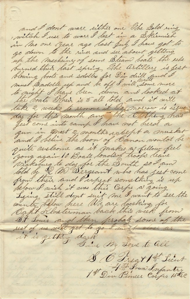 I have got my watch and chain. Both are broken and i don’t wear either one. The gold ring which I used to wear I lost in a skirmish in Missouri one year ago last July. I have got to go down to the river and see about getting up the machinery of some steamboats the rebs burned there last spring.
