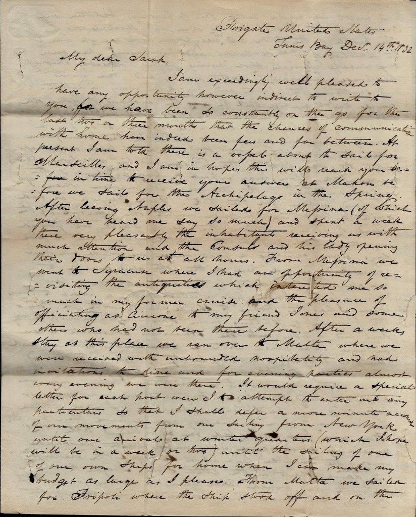 I am exceedingly well pleased to have any opportunity, however indirect, to write to you, for we have been so constantly on the go for the last two or three months that the chances of communication with home have indeed been few and far between. At present I am told there is a vessel about to sail for Marseilles and I am in hopes this will reach you in time to receive your answer at Mahon before we sail for the Archipelego in the spring.