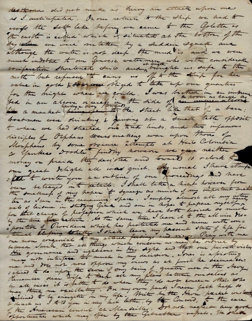On my return to the ship, we had to cross the salt lake before we came to the Goletta as the castle is called which is situated at the bottom of the bay. We were overtaken by a sudden squall and although the water is not deep, the mud is and we were much indebted to our Genoese watermen who with considerable vociferation shortened sail and at length brought us safe to the castle but refused to carry us off to the ship for her value in gold & so we were obliged to take up our quarters for the night where we could. I was berthed in an improvised bed in the recess in the side of a room as large as a market, having a door towards the street like that of a barn. Boatmen were drinking & gaming at a small table opposite to where we had stretched our tired limbs and two infamous disciples of Orpheus were making war upon those of Morpheus by some obscene attempts at Hail Columbia & Yankee Doodle. Finding, however, we gave neither money or praise, they desisted and towards 10 o’clock to our great delight, all was quiet.