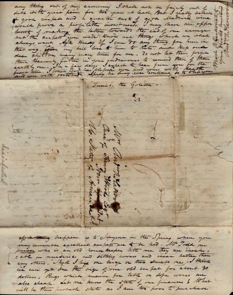 Remember, dear wife, to keep all my plans between ourselves as in all cases it is better to do when they do not concern others who may think me vacillating. For my own part I never felt half so inclined to be energetic in my life. Write by the Havre packet & direct to us. I told you in my last letter by the Concord, to the care of the American consul at Marseilles. Do not neglect any good opportunities which may offer by the Gibraltar vessels. We shall go, if nothing happens to Smyrna in the spring where you may remember excellent carpets are to be had. Mr. Todd, our purser, who is an old housekeeper tells me they are invaluable in nurseries and sitting rooms and wear better than any others. Shall I buy one large or two small ones? I think we can get one the size of our old carpet for about 30 dollars. Rugs which answer for table or sofa covers are also cheap. Let me know the state of our finances. What will be their probable state as I am too poor to purchase anything out of my economy. I shall not be fairly out of debt with great pain for two years at least. But I really believe a good carpet and a quarter cask of good Madeira wine would prove a profitable investment…Kiss our dear children many many times for me. Do not let them forget their Heavenly Father in your endeavors to remind them of their earthly one. In a few days I expect to hear from you for the first time. I trust God has blessed you and yours with health and you with fortitude. I pray He may ever continue to bless you.