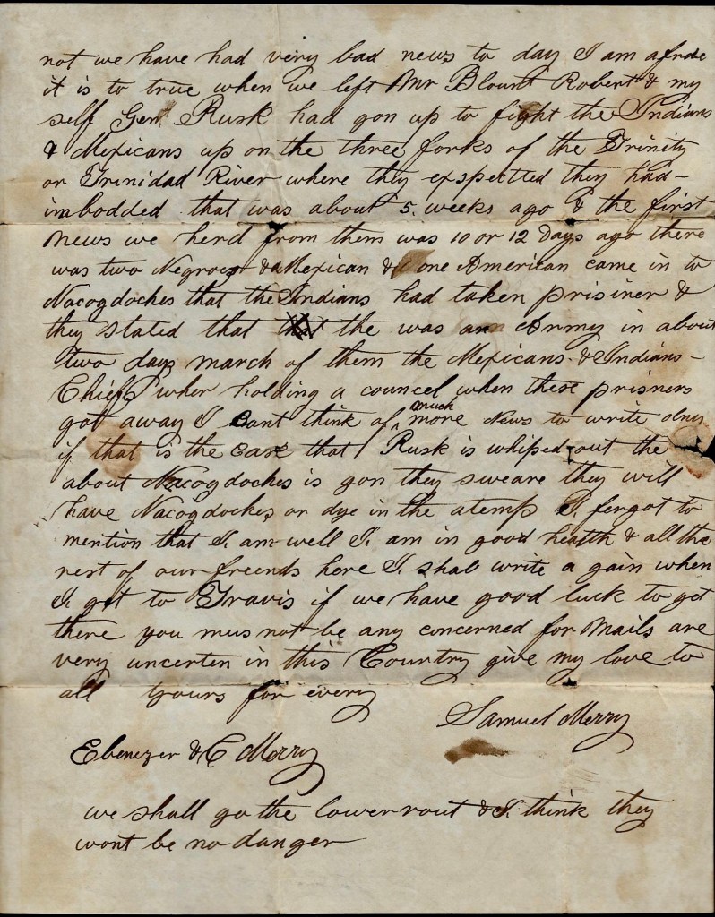 We have just heard that our Texas Army commanded by General Rusk has been cut off by the Indians. If so, we will see the devil. We have 300 miles of Indian country to go through. I merely write a few lines to get Samuel [free postage. I will give you a full detail when I get home, if we are lucky enough to get there.