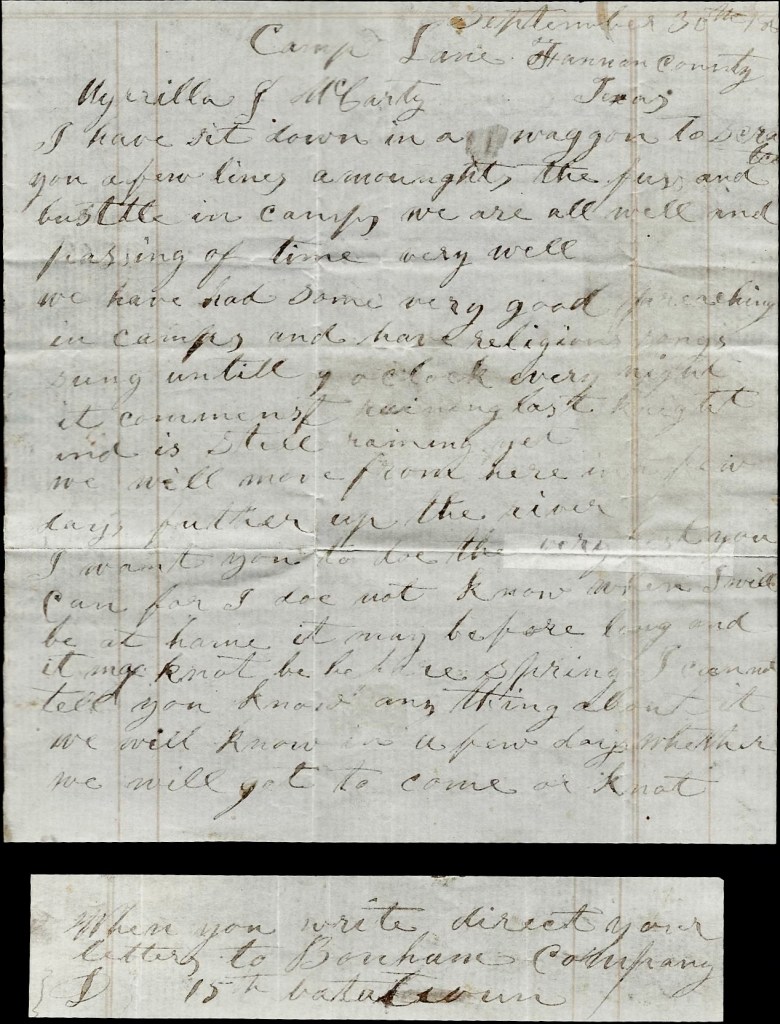 The following letter was written by William McCarty (1821-1883) to his wife, Myrilla Jane Wilson (1827-1882). The couple were married in 1846 and had at least two children by the time this letter was written. William was born in Tennessee and was residing in Bradley county, Tennessee, when the 1850 US Census was collected. Ten years later he and Marilla were enumerated in Plano, Collin county, Texas.