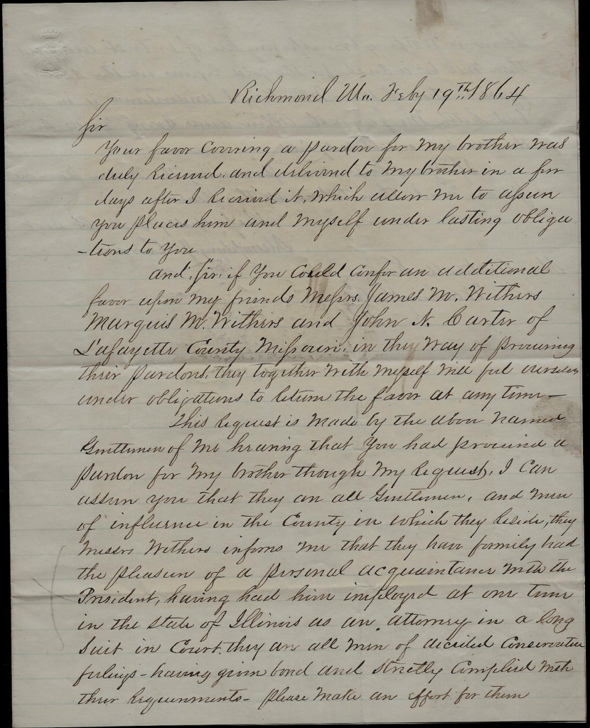 And, Sir, if you could confer an additional favor upon my friends Messrs. James M. Withers, Marquis M. Withers, and John N. Carter of Lafayette County, Missouri, in the way of procuring their pardons, they together with myself will feel ourselves under obligations to return the favor at any time.