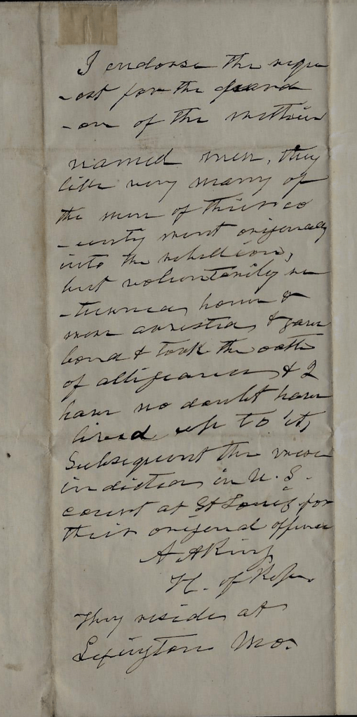 I endorse the request for the pardon of the within named men. They, like very many of the men of their county went originally into the rebellion, but voluntarily returned home & were arrested, & gave bond & took the oath of allegiance & I have no doubt have lived up to it. Subsequent they were indicted in U.S. Court at St. Louis for their original offense.
