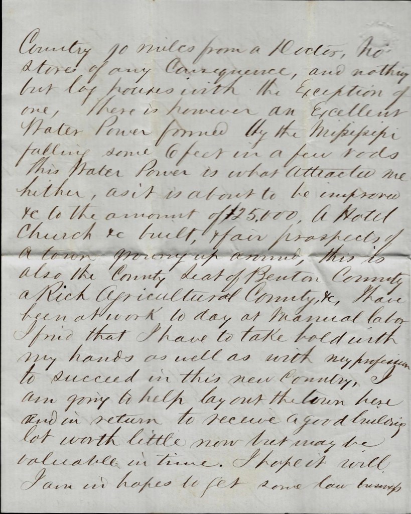 I am now truly in a new country, 90 miles from a doctor, no stores of any consequence, and nothing but log houses with the exception of one. There is, however, and excellent water power formed by the Mississippi falling some 6 feet in a few rods. This water power is what attracted me hither as it is about to be improved, &c. to the amount of $25,000. A hotel, church, &c. built, and fair prospects of a town growing up around. This is also the county seat of Benton county—a rich agricultural county, &c.