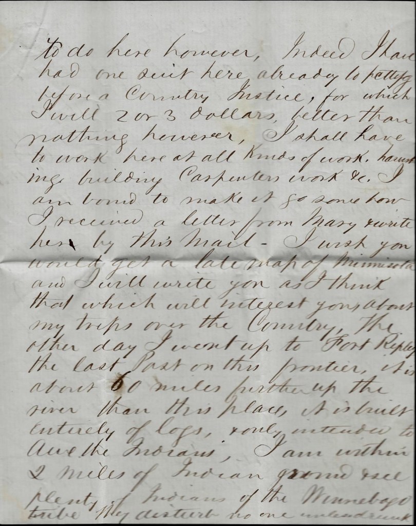 I received a letter from Mary & write her by this mail. I wish you would get a late map of Minnesota and I will write you as I think that which will interest you about my trips over the country. The other day I went up to Fort Ripley, the last post on this frontier. It is about 60 miles further up the river than this place. It is built entirely of logs & only intended to awe the Indians. I am within 2 miles of Indian ground & see plenty of Indians of the Winnebago tribe. They disturb no one unless drunk.