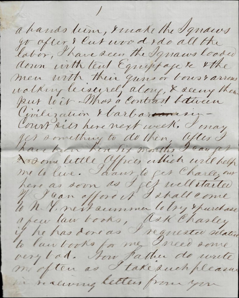 I have been at work today at manual labor. I find that I have to take hold with my hands as well as with my profession to succeed in this new country. I am going to help lay out the town here and in return to receive a good building lot worth little now but may be valuable in time. I hope it will. I am in hopes to get some law business to do here, however. Indeed, I have had one suit here already to [ ] before a county justice for which I will receive] 2 or 3 dollars—better than nothing however. I shall have to work here at all kinds of work—harvesting, building, carpenter’s work, &c. I am bound to make it go somehow.