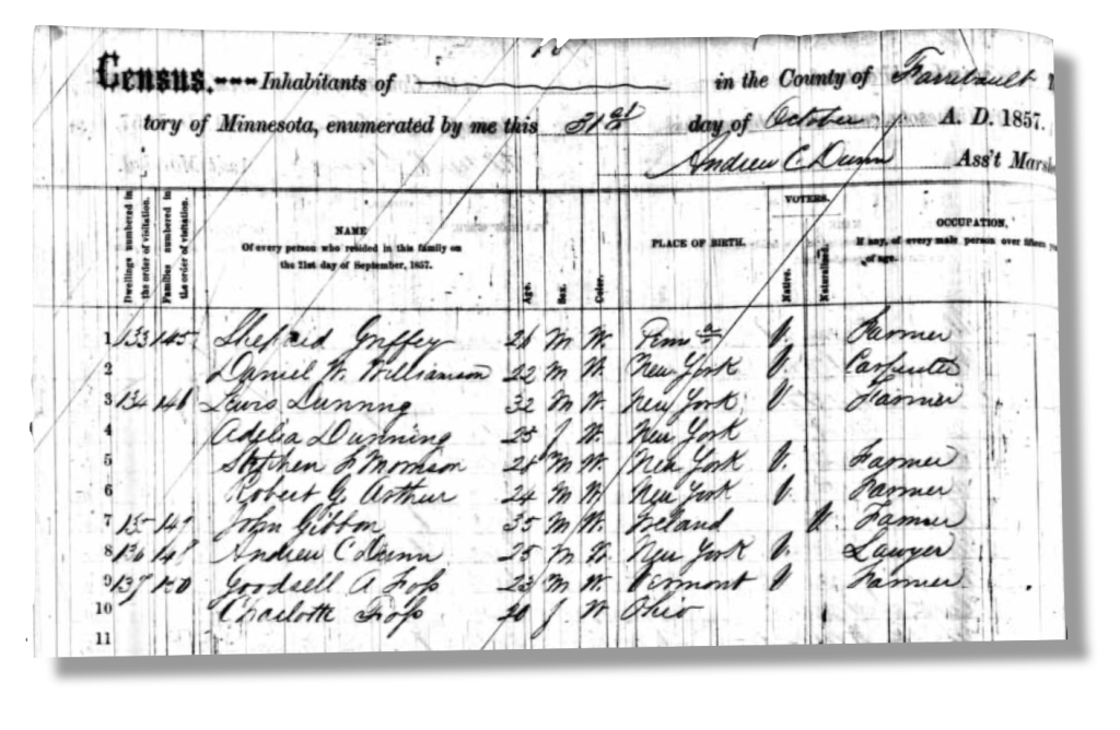 In the 1860 US Census, Andrew was enumerated in Verona, Faribault county, Minnesota, making a living as a lawyer. He was married on 1 January 1859 to Diana Jane Smith (1836-1913) and they had an 8 months old daughter named Mary born in late 1859. He was living in Winnebago, Faribault county in 1900, enumerated as a 65 year-old lawyer. According to State history, Andrew is credited with having been the founder of the town of Winnebago. He served as Clerk in the House of Representatives (1864-1866) and as a State Representative (1881-1882. His home in Winnebago is on the National Register of Historic Places.