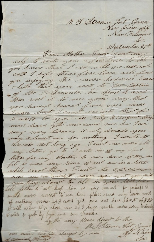 The following letter was written by Franklin (“Frank”) Garland who enlisted at the age of 19 on 20 November 1861 as a Landsman in the US Navy. He was later promoted to a Paymaster’s Steward and then mustered out of the Navy on 10 December 1864. He was initially on the receiving ship USS Ohio but then assigned to the USS Commodore, a side wheel steamer built in New Orleans and fitted for service with the West Gulf Blockading Squadron. She was renamed the Fort Gaines on 1 September 1864. He may have possibly served aboard the USS Portsmouth as well.