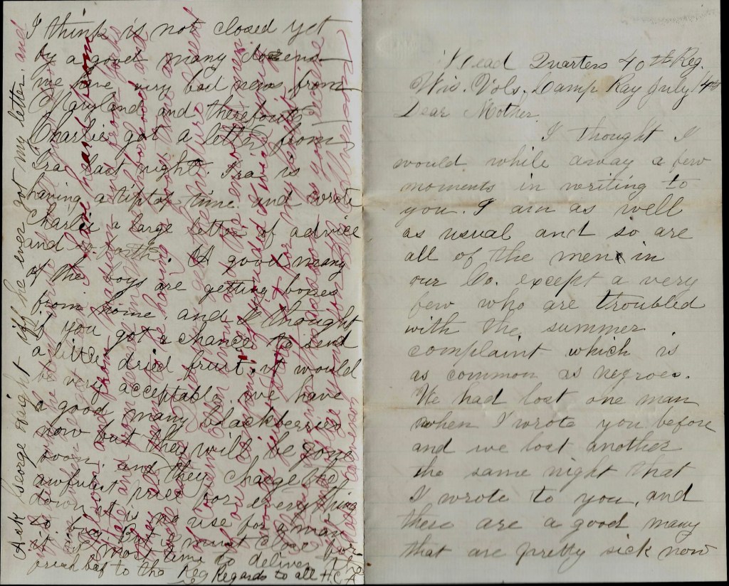 I thought I would wile away a few moments in writing to you . I am as well as usual and so are all of the men in our company except a very few who are troubled with the summer complaint which is as common as negroes. We had lost one man when I wrote you before and we lost another the same night that I wrote to you, and there are a good many that are pretty sick now and some of them are dangerous. But for our company, they are the best appearing company in the regiment and they can stand more duty than a great many companies for some reason or other.