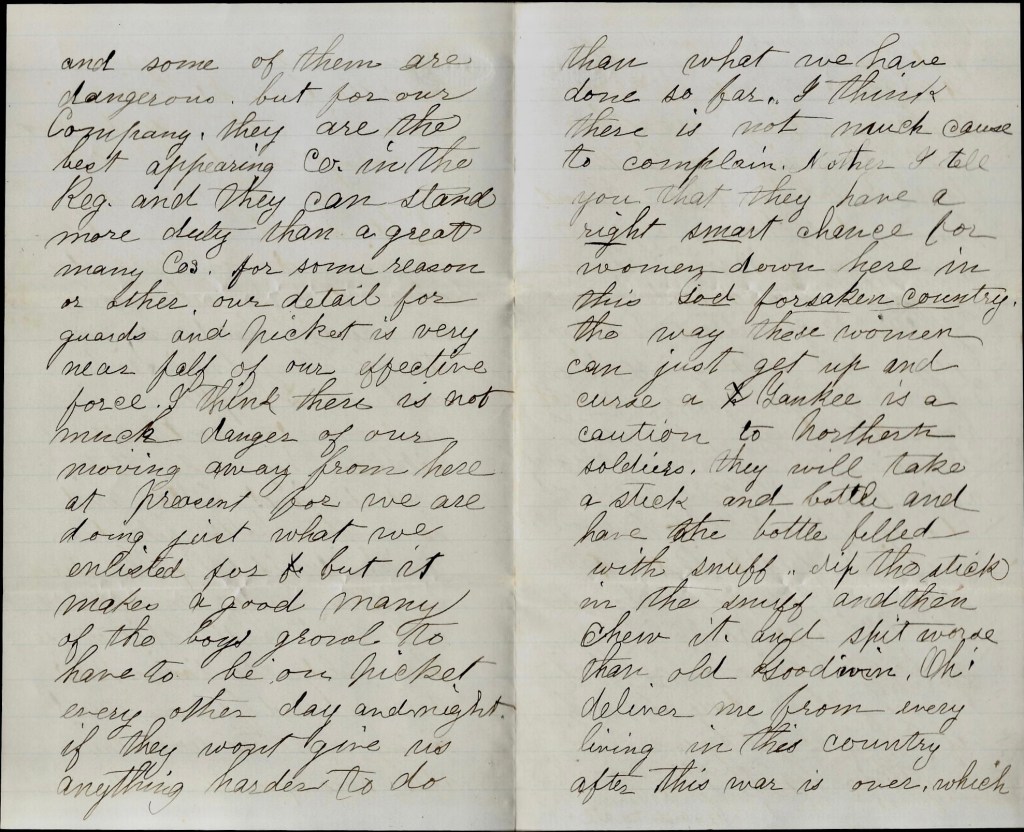 Mother, I tell you that they have a right smart chance for women down here in this God forsaken country. They way these women can just get up and curse a Yankee is a caution to Northern soldiers. They will take a stick and bottle and have the bottle filled with snuff, dip the stick in the snuff, and then chew it, and spit worse than old Goodwin. 1 Oh! deliver me from ever living in this country after this war is over, which I think is not closed yet by a great many dozens.