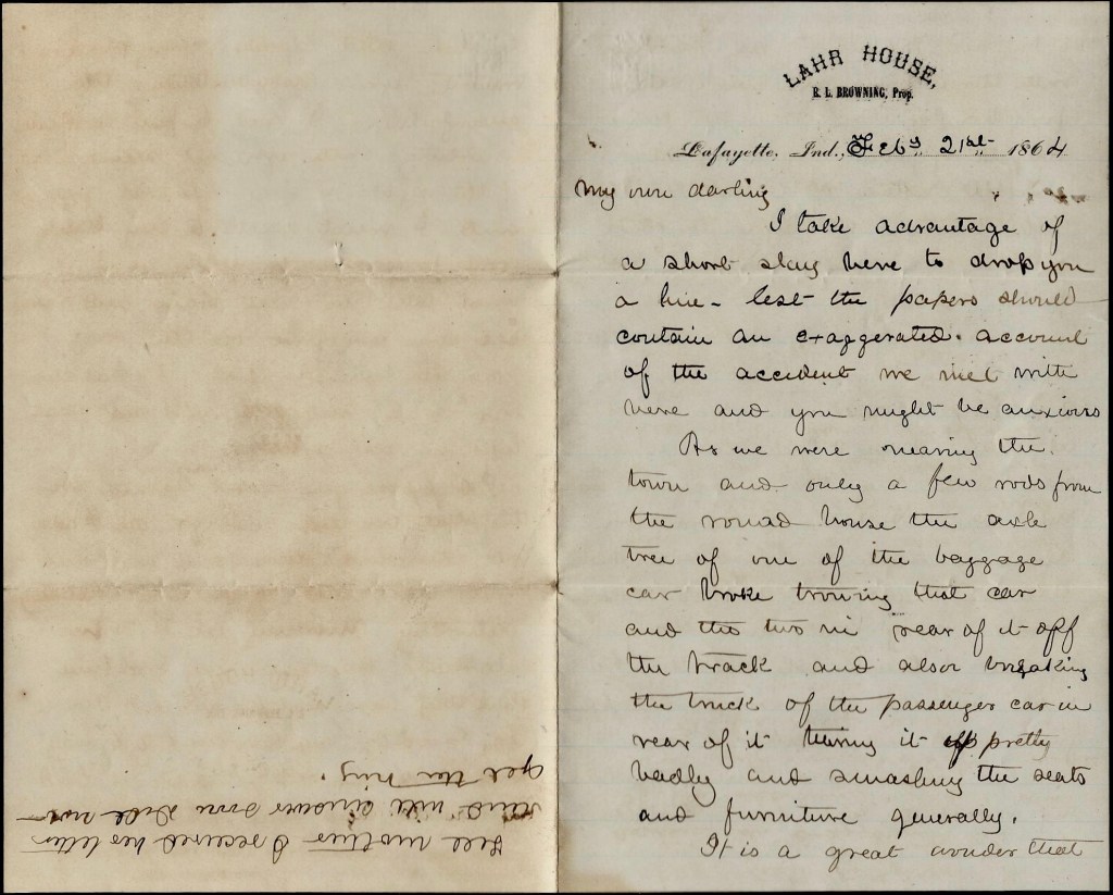 Both of Duffield’s letters describe surviving not one, but two separate train accidents while returning from a Veteran’s furlough to the battle front in February 1864 reminding us of the uncertain and precarious state of 19th century transportation.