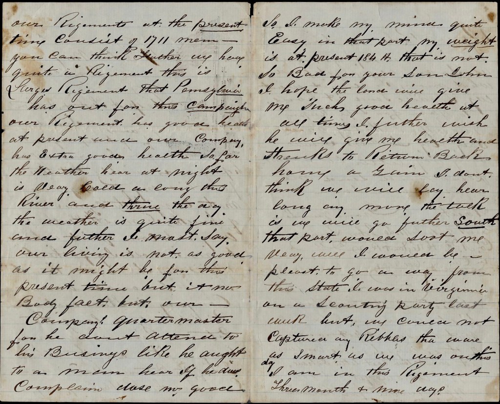 Our regiment at the present time consists of 1,711 men. You can think, father, we have quite a regiment. This is the largest regiment that Pennsylvania has out for the campaign. Our regiment has good health at present, and our company has extra good health so far.