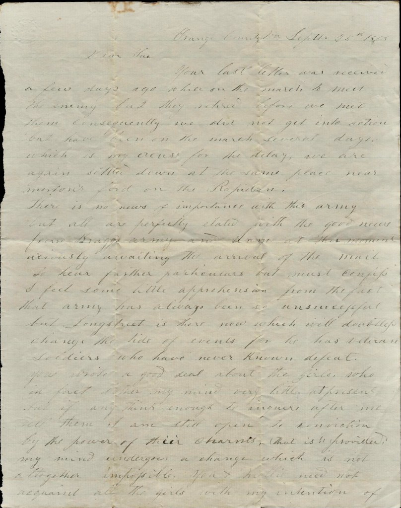 There is no news of importance with this army but all are perfectly elated with the good news from Bragg’s army and I am at this moment anxiously awaiting the arrival of the mail to hear further particulars but must confess I feel some little apprehension from the fact that army has always been so unsuccessful. But Longstreet is there now which will doubtless change the tide of events for he has veteran soldiers who have never known defeat.