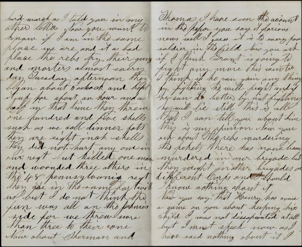 Now about Sherman and Thomas. I have seen the account in the paper [that] you say is glorious news. Well, I guess it is to every poor soldier in the field. Now you ask if I think Grant is going to fight anymore this winter. I think if he can gain anything by fighting, he will fight. And if he can do better by not fighting, he will lie still. This is all that I can tell you about him. This is my opinion.