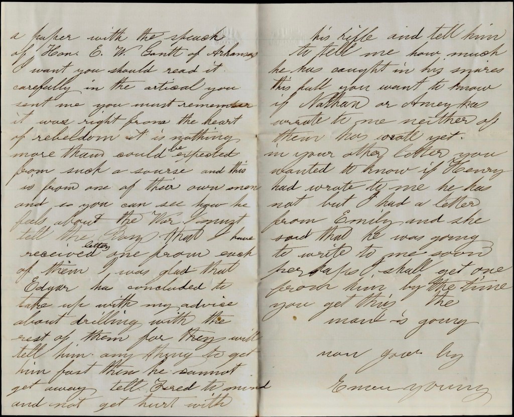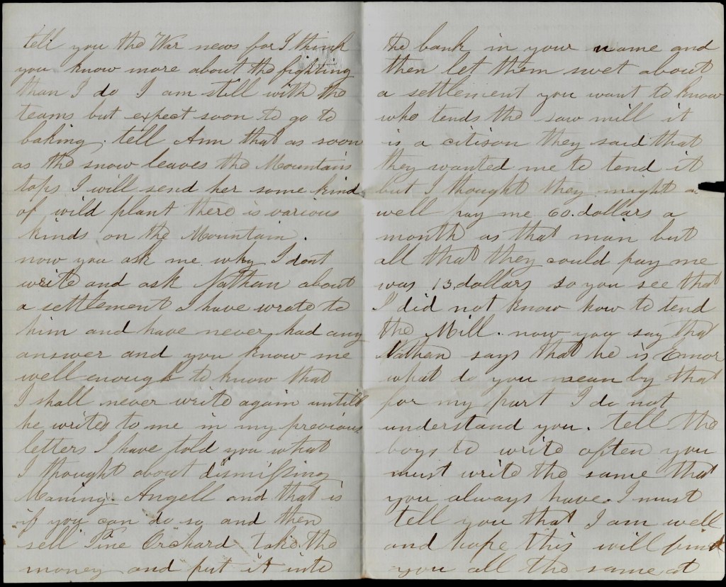 You want to know who tends the saw mill. It is a citizen. They said that they wanted me to tend it but I thought they might as well pay me 60 dollars a month as that man but all that they could pay me was 13 dollars so you see that I did not know how to tend the mill. Now you say that Nathan says that he is Emor. What do you mean by that? For my part, I do not understand you. Tell the boys to write often. you must write the same that you always have. I must tell you that I am well and hope this will find you all the same at home. Now the mail going and I must draw my letter to a close by bidding you goodbye. Yours truly, — Emor Young