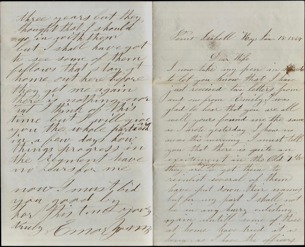 Tell both of the boys that they must write as often as they can. You must do the same. The officers have just been round to see how many men are willing to reenlist. I must tell you that there is about three-fourths that will go for three years but they thought that I should go in with them. But I shall have got to see some of them fellows that stay at home out here before they get me again. There is nothing more that I think of this time but I will give you the whole particulars in a few days how things progress in the regiment. Have no fears for me.