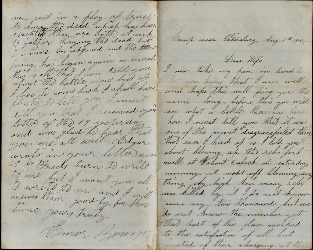 Long before this you will see what a battle there has been here. I must tell you that it was one of the most disgraceful things that ever I heard of as I told you about blowing up the reb’s fort. Well, at about 5 o’clock on Saturday morning, it went off, blowing everything sky high. How many rebs was killed by it, I do not know. Some say two thousands but we do not know the number yet. That part of the plan worked to the satisfaction of all but instead of charging at the time that the fort was blown up, they only left with a light force. They went in and was repulsed. Then this the 2nd Brigade of our Division, the the 4th Division which is the colored troops was ordered to charge. They went in and drove everything before them. They was supported by the rest of the 9th Corps and one division of the 10th Corps—in all, perhaps ten thousand.