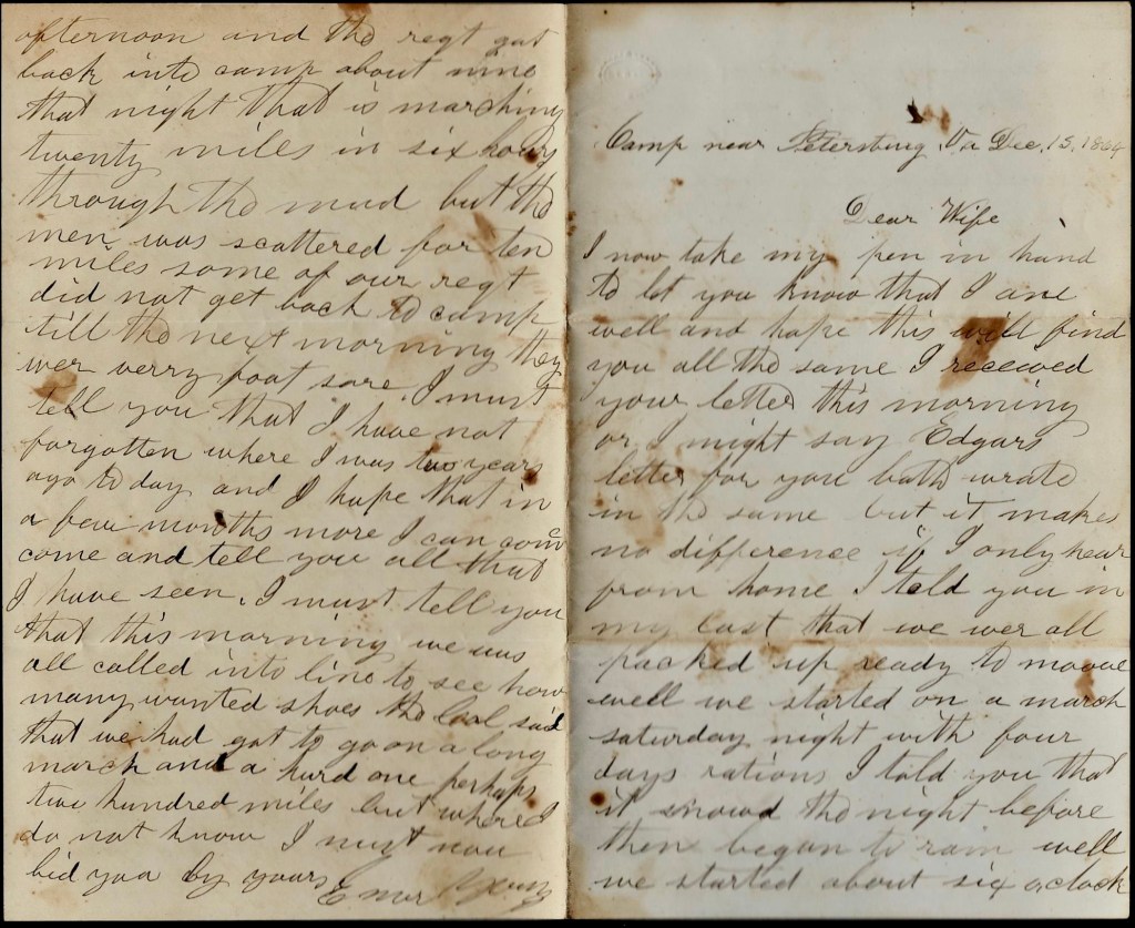 Well, as I said, we started when the rain was pouring in torrents. The mud was over shoe for more than half of the way, but rain, snow, or the mud did not stop us. We marched twenty miles and halted at about four in the morning, Then the cavalry went out and found that there was no rebs and found that the 5th and 2nd Corps were all safe and had crossed the river on their way back after tearing up the [Weldon] railroad. You will see the whole particulars in the paper long before you get this. After the troops had got over the river, we had orders to fall in and march back to our old camp again. This was pretty hard to march the same ground over again but that was the order and it had to be obeyed. As I told you, we expected to march the night before we did march so you see there was but little sleep through the camp that night, then marched all Saturday night, then Sunday night through the mud with sore and blistered feet. We commenced our long march again about three in the afternoon and the regiment got back into camp about nine that night. That is marching twenty miles in six hours through the mud. But the men was scattered for ten miles. Some of our regiment did not get back to camp till the nrext morning. They were very foot sore.