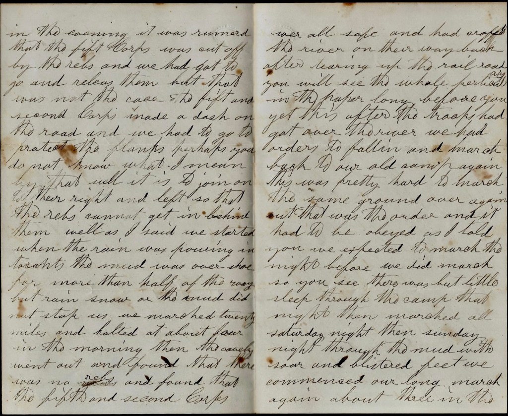 I told you in my last that we were all packed up ready to move. Well we started on a march Saturday night with four days rations. I told you that it snowed the night before, then began to rain. Well, we started about six o’clock in the evening. It was rumored that the 5th Corps was cut off by the rebs and we had got to go and release them but that was not the case. The 5th and 2nd Corps made a dash on the road and we had to go to protect the flanks. Perhaps you do not know what I mean by that. Well, it is to join on to their right and left so that the rebs cannot get in behind them.