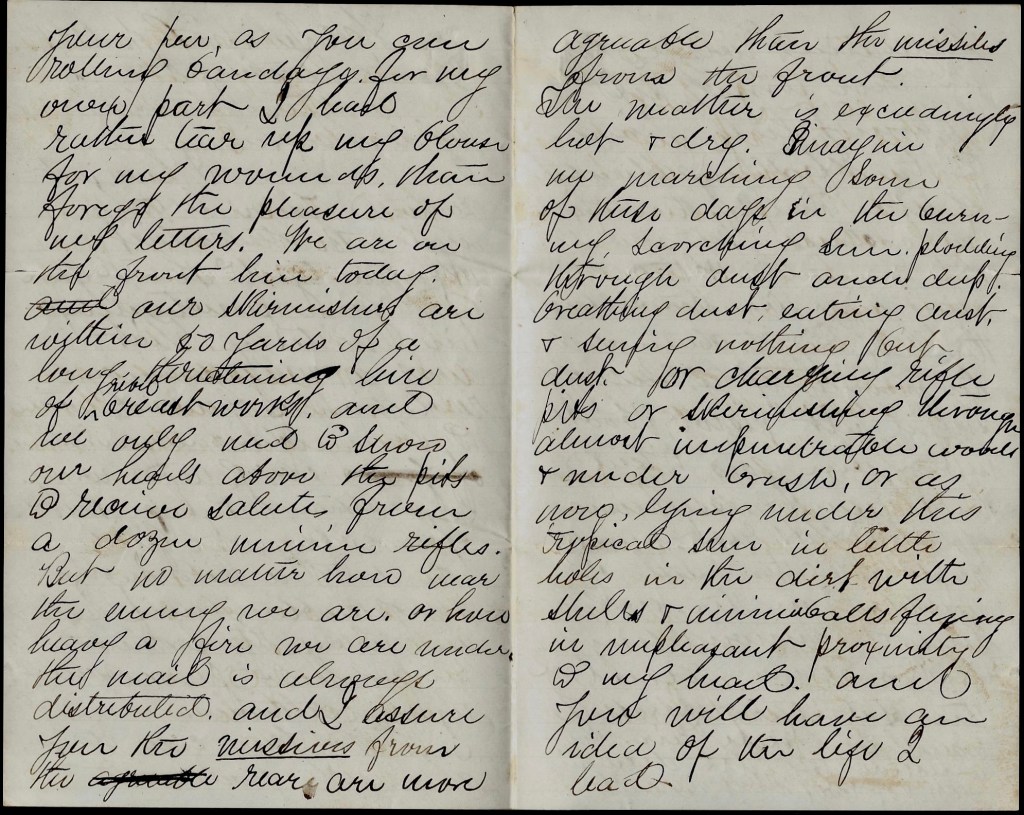 The weather is exceedingly hot and dry. Imagine us marching some of these days in the burning, scorching sun, plodding through dust, eating dust, and seeing nothing but dust. Or charging rifle pits or skirmishing through almost impenetrable woods & under brush, or as now, lying under this tropical sun in little holes in the dirt with shells and minié balls flying in unpleasant proximity to my head, and you will have an idea of the life I lead.