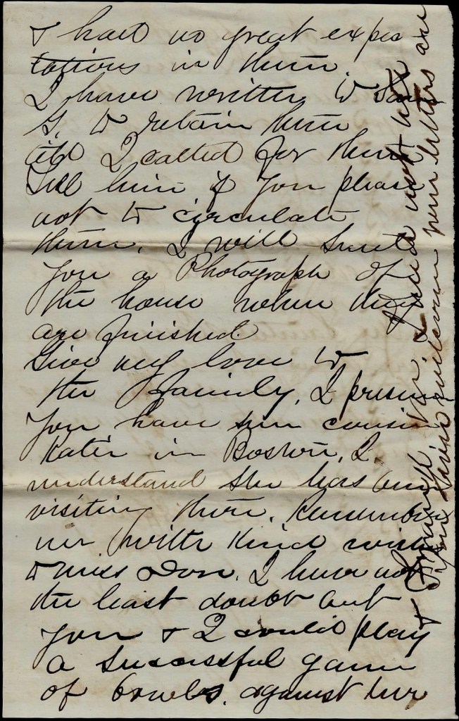 I have written to [ ] to retain them till I called for them. Tell him if you please not to circulate them. I will mail you a photograpg of the house when they are finished. Give my love to the family. I presume you have seen cousin Katie in Boston. I understand she has been visiting there. Remember e with kind wishes to Miss [ ]. I have not the least doubt you and I could play a successful game of bowls against her…