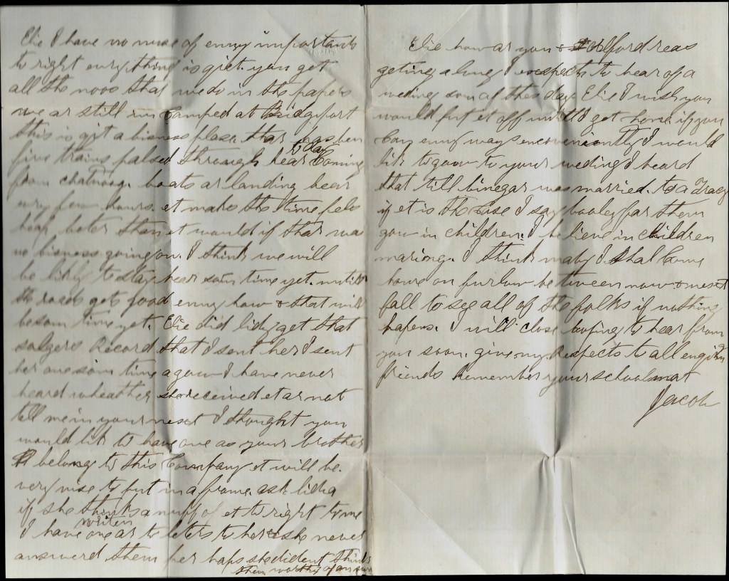 Ellie, how are you and Alford Rease getting along? I expect to hear of a wedding one of these days. Ellie, I wish you would put it off until I get home if you can anyway conveniently. I would like to go to your wedding. I heard that Till Binegar [Matilda Jane Binegar] was married to a [James W.] Tracy. 2 If it is the case, I say Bully for them. Go in children. I believe in children marrying. I think maybe I shall come home on furlough between now and next fall to see all of the folks if nothing happens. I will close hoping to hear from you soon. Give my respects to all enquiring friends. Remember your school mate, — Jacob