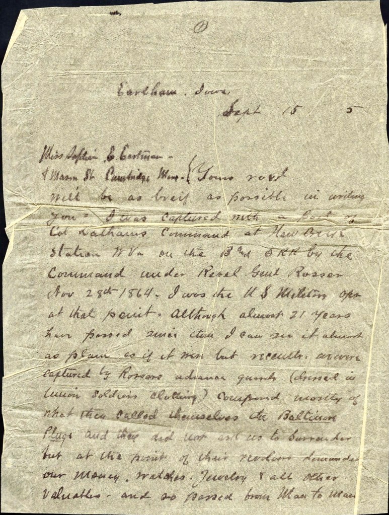 I was captured with a part of Col. Latham’s command at New Creek Station, W. Va. on the Baltimore & Ohio Railroad by the command under Rebel General Rosser November 28th 1864. I was the U. S. Miltary Operator at that point. Although almost 21 years have passed since then, I can see it almost as plain as if it were but recent. We were captured by Rosser’s advance guards (dressed in Union soldier’s clothing) composed mostly of what they called themselves the Baltimore Plugs and they did not ask us to surrender but at the point of their revolvers surrender our money, watches, jewelry, and all other valuables—and so passed from man to man before their regulars come up and the latter put us in form[ation] for taking our names and occupation & marching on towards Richmond.