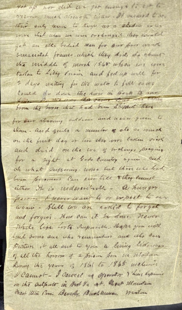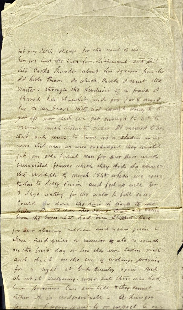 Through the kindness of a friend, I shared his blanket, and for 7 or 8 days I lay on my back with not enough strength to get up. Nor did we get enough to eat to recover much strength either. It seemed to be their only aim to keep us a shadow as we were—that when we were exchanged they would get an able bodied man for our poor weak emaciated frames, which they [finally] did do about the middle of March 1865 when we were taken to Libby Prison and fed up well for two days waiting for the water to fall so we could go down the river in boats to our lines.