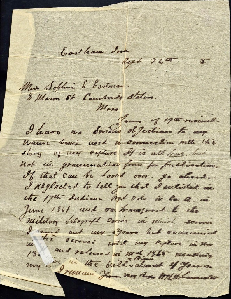 Yours of 19th received. I have no serious objections with [your use of] the story of my capture. It is all true, but not in grammatical form for publication. If that can be looked over, go ahead. I neglected to tell you that I enlisted in the 17th Indiana Regt. Vols in Co. A. in June 1861 and was transferred to the military telegraph service in which service I served out my 3 years but remained in the service until my capture in Nov 1864 and released in March 1865, making my time in the field and as prisoner almost 4 years. I remain yours very respectfully, W. H. H. Lancaster.