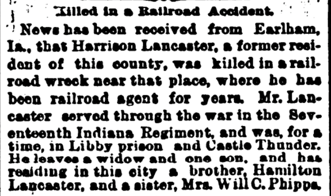 As he states in his letter, William lived out his days in Earlham, Madison county, Iowa, working for the railroad. Sadly, William was killed in a horrific railroad accident near Earlham on 2 June 1891 at the age of 51 (see clippings below).
