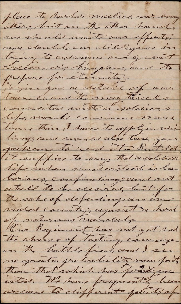 To give you a detail of our travels and the many trials connected with a soldier’s life would consume more time than I have to apply in writing, and would also task your patience to read it. But let it suffice to say that a soldier’s life when understood is laborious, confining, and not at all to be desired, but for the sake of defending an invaded country against a hoard of notorious vandals.