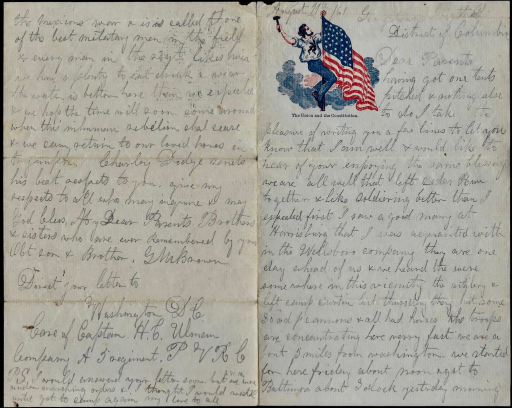 The letter was datelined from the Georgetown Hospital on 11 August 1861 shortly after the regiment’s arrival in the District of Columbia.