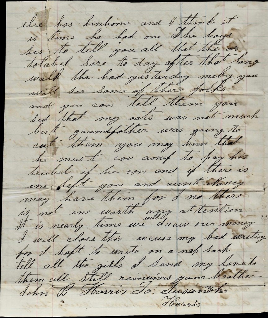 It is nearly time we will draw our money. I will close this. Excuse my bad writing for I have to write on a knapsack. Tell all the girls I send my love to them all. Still remain your brother, — John B. Harris