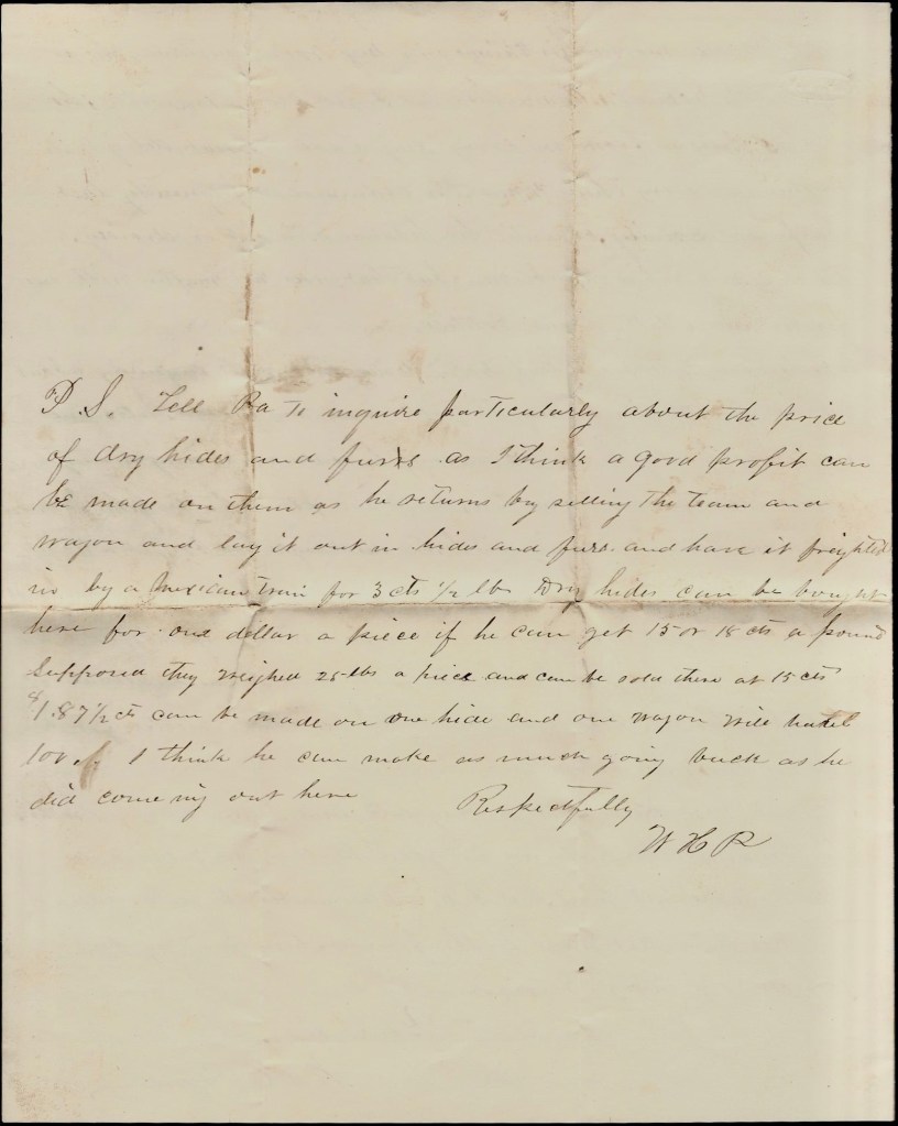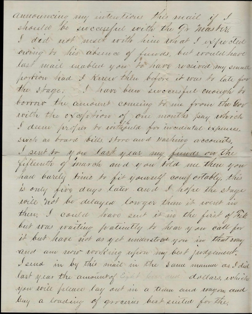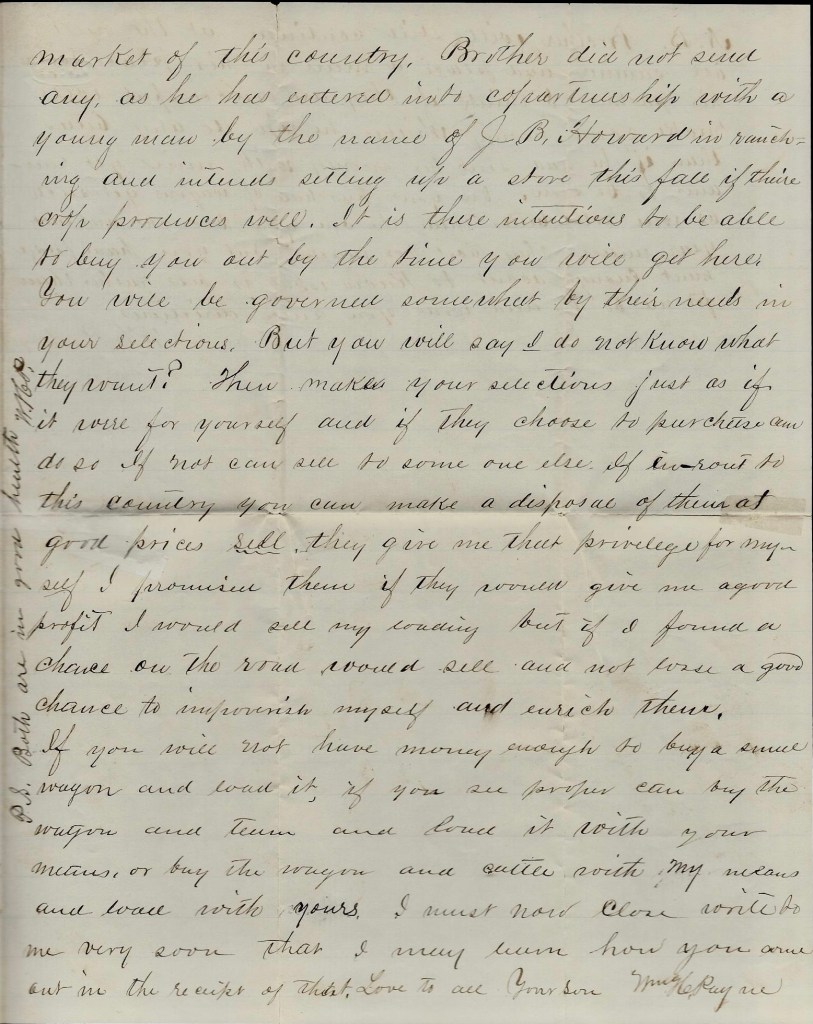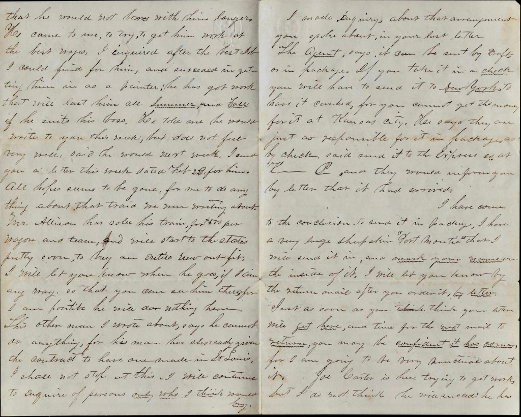 All hopes seem to be gone for me to do anything about that trade we were writing about. Mr. Allison has sold his train for $500 per wagon and team, and will start to the States pretty soon to buy an entire new outfit. I will let you know when he goes if I can anyway, so that you can see him there, for I am positive he will do nothing here. This other man I wrote about says he cannot do anything for his man has already given the contracts to have one made in St. Louis. I shall not stop at this. I will continue to enquire of persons only who I think would buy. I made enquiries about that arrangement you spoke about in your last letter. The agent says it can be sent by draft or in package. If you take it in a check, you will have to send it to New York to have it cashed, for you cannot get the money for it at Kansas City. He says they are just as responsible for it in package as by check. Said send it to the Express as at Kansas City and they would inform you by letter that it had arrived.