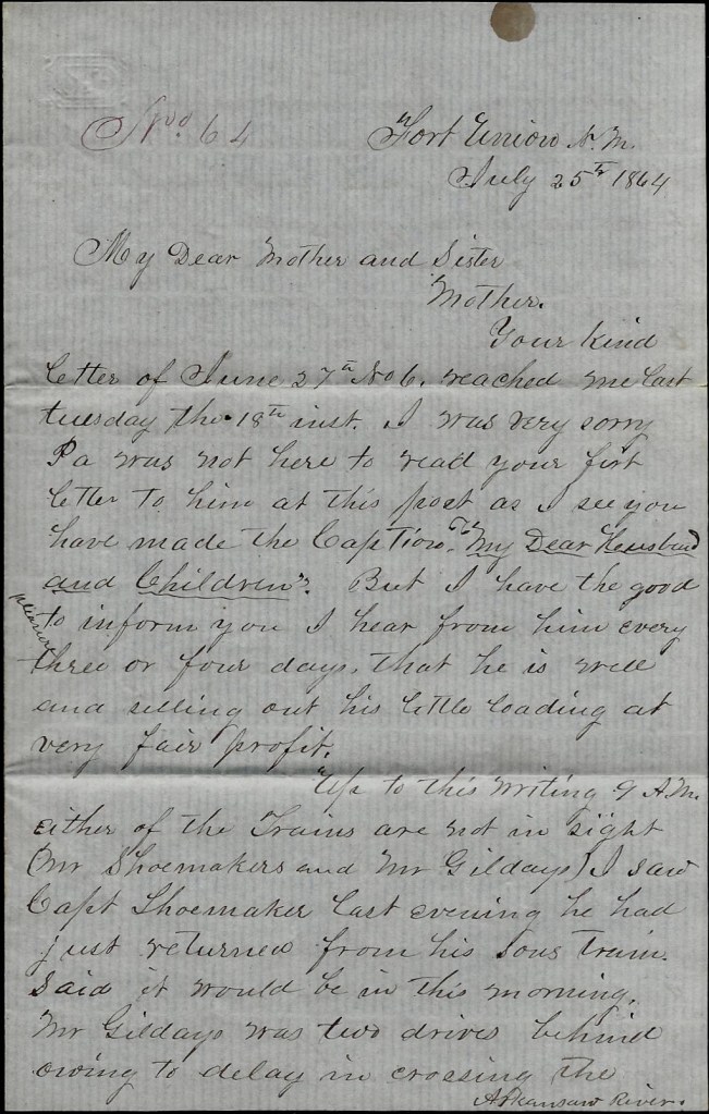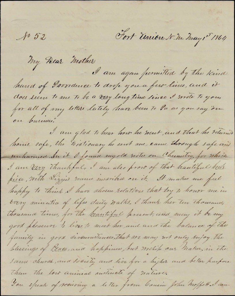 From these five letters (only two transcribed), we learn that Willie was working as a civilian in the Quartermaster’s Department at Fort Union in New Mexico Territory during the Civil War. Working in the same vicinity as a day laborer was his younger brother, George Winchester Payne (1841-1909). George’s obituary, published in the Selma Enterprise [Selma, California] on 30 October 1909, claims that he fought for the Confederacy throughout the entire Civil War under Old Pap Price who would call him “Sonny” but we know from these letters that by January 1864, George was working in New Mexico and seems to have been there for some time. It may be that both Willie and George went to New Mexico to avoid further service in the Civil War.
