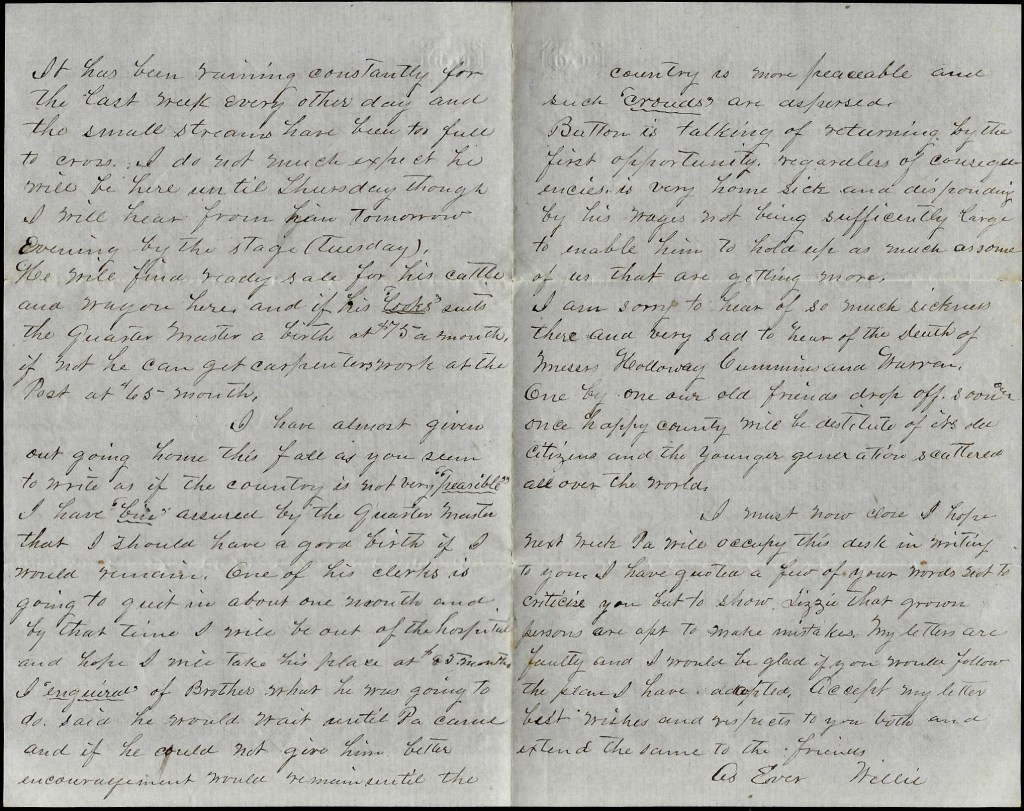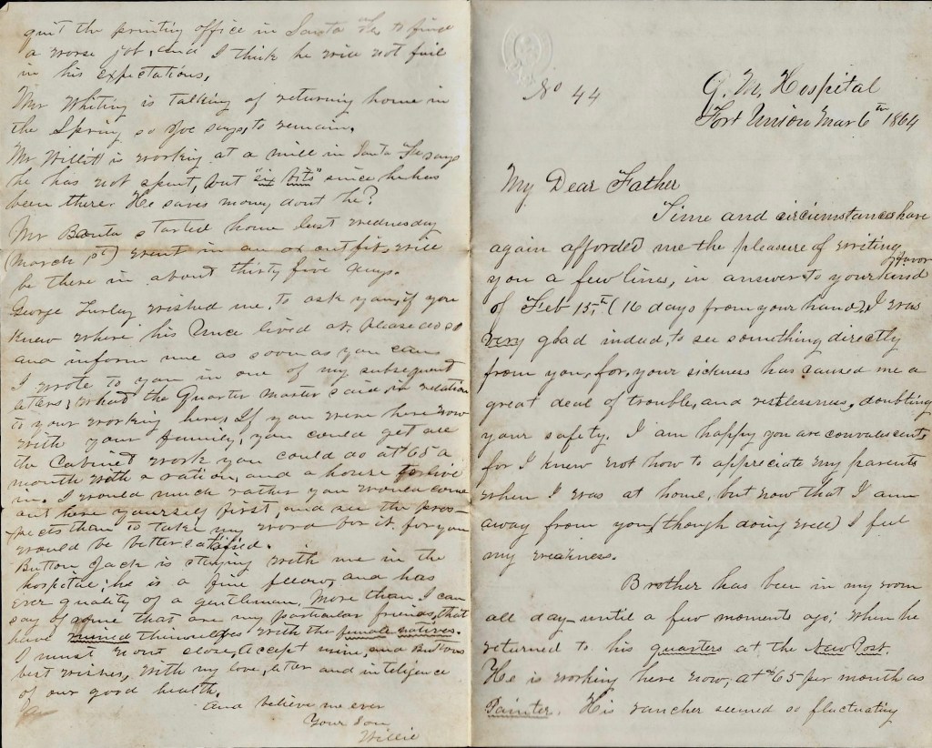 I must now close. Accept mine and Button’s best wishes. With my love, letter and intelligence of our good health, and believe me ever your son, — Willie