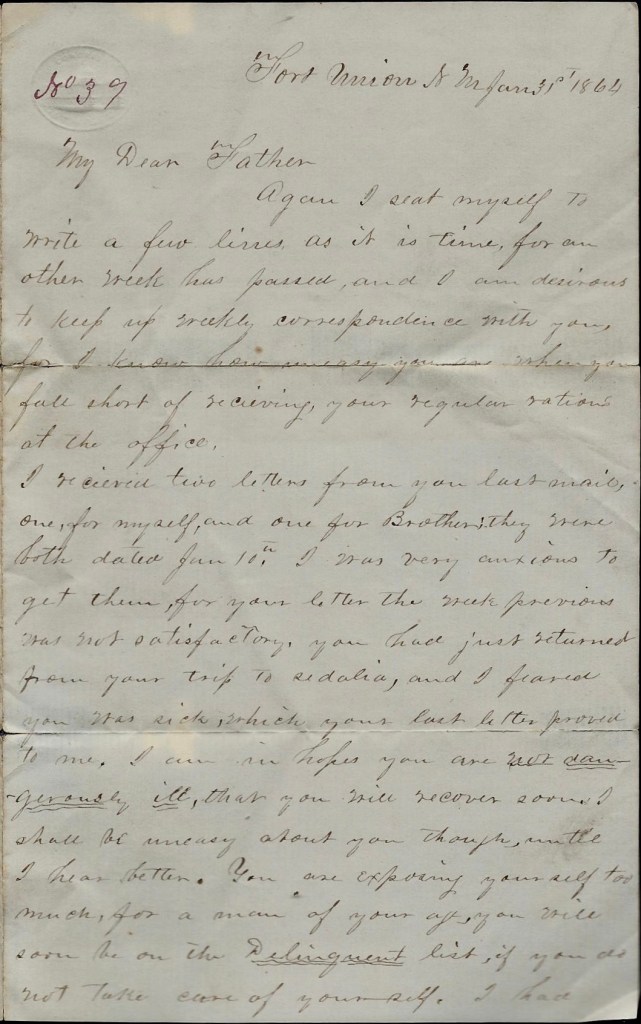 Time and circumstances have again afforded me the pleasure of writing you a few lines in answer to your kind favor of February 15th (16 days from your hand). I was very glad indeed to see something directly from you, for your sickness has caused me a great deal of trouble and restlessness, doubting your safety. I am happy you are convalescing for I knew not how to appreciate my parents when I was at home, but now that I am away from you (though doing well), I feel my weakness.