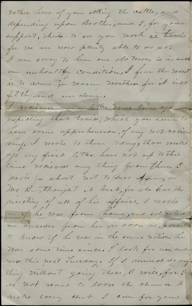 I received your letter some time ago respecting that trade which you see, to have some apprehension of my not receiving. I wrote to them today, three weeks ago, my first letter. Have not up to this time received anything from them. I wrote a short note to Mrs. Avery as Mr. B thought it best for she has the directing of all of his affairs. I wrote as if he was from home and solicited an answer from her as soon as possible to know if he was in the same notion he was some time since. I look for an answer this next Tuesday. If I cannot do anything without going there, I will, for I do not want to lose the chance to make every cent I can for you.