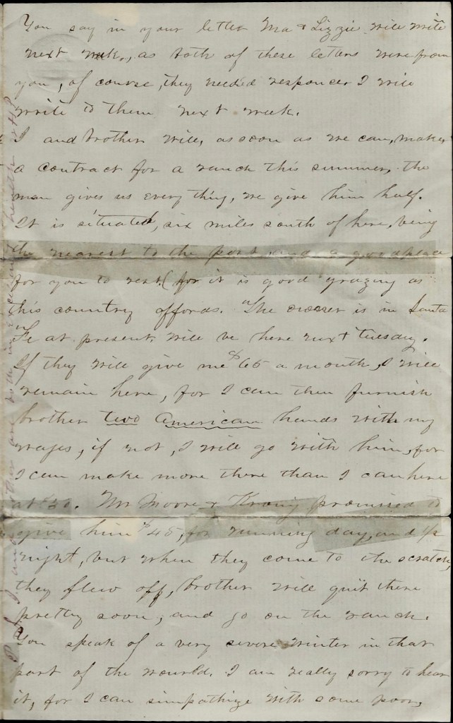 I and brother will as soon as we can, make a contract for a ranch this summer. The man gives us everything. We give him half. It is situated six miles south of here, being the nearest to the pond and a good place for you to rest, for it is as good grazing as this country affords. The owner is in Santa Fe at present. Will be here next Tuesday. If they will give me $65 a month, I will remain here for I can then furnish brother two American hands with my wages. If not, I will go with him for I can make more there than I can here at $30. Mr. Moore & Krany promised to give him $45 for running day and half the night, but when they came to the scratch, they flew off. Brother will quit there pretty soon and go on the ranch.