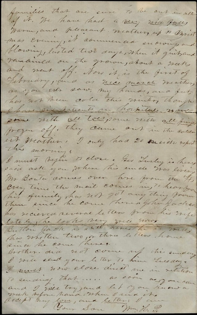 You speak of a very severe winter in that part of the world. I am really sorry to hear it for I can sympathize with some poor families that are sure to be out in all of it. We have had a very nice fall—warm and pleasant weather up to Christmas evening [when] it commenced snowing and blowing. It lasted two days when it quit and remained on the ground about a week and went off. Now it is the first of February and as nice March weather as you ever saw. My hands and feet has not been cold this winter though I have six patients in hospital now—some with all toes, some with all fingers frozen off. They came out in the coldest weather. I only had 20 on sick report this morning.